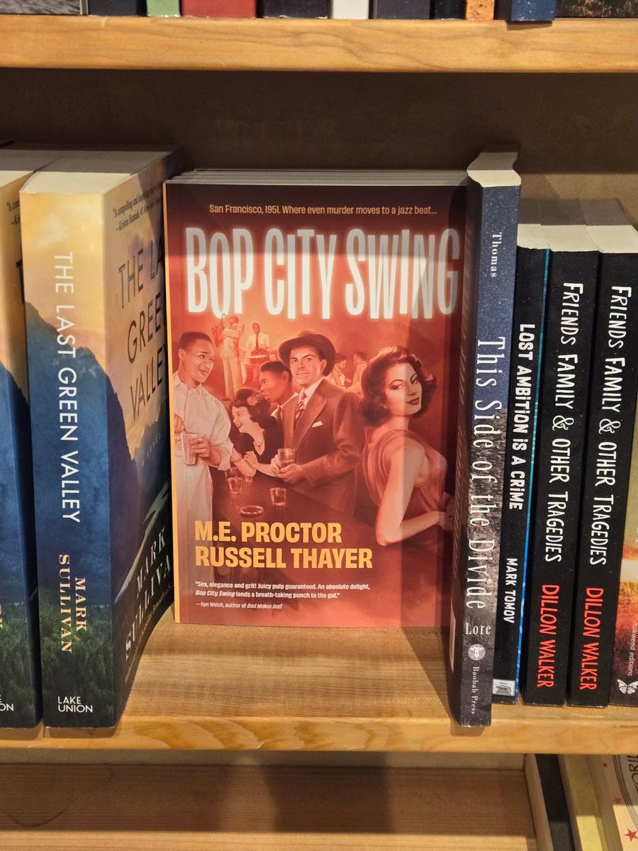 Russell Thayer and M.E. Proctor’s Bop City Swing masterfully harkens back to the noir classics of yesteryear, with the soulfulness of a Charlie Parker riff on foggy night. Bop City Swing is a riveting cat and mouse tale pitting two contemporary grit noir characters —Proctor’s formidable Detective Tom Keegan and Thayer’s deadly femme fatale, Vivian/Gunselle—in a tale that twists and turns like a brakeless ride down Mulholland Drive in a 1940s Caddy. Thayer and Proctor have given us a classic contemporary take on old school noir that leaves the reader so satisfied they’ll want to fire up a Chesterfield and pour a double bourbon in the afterglow!
